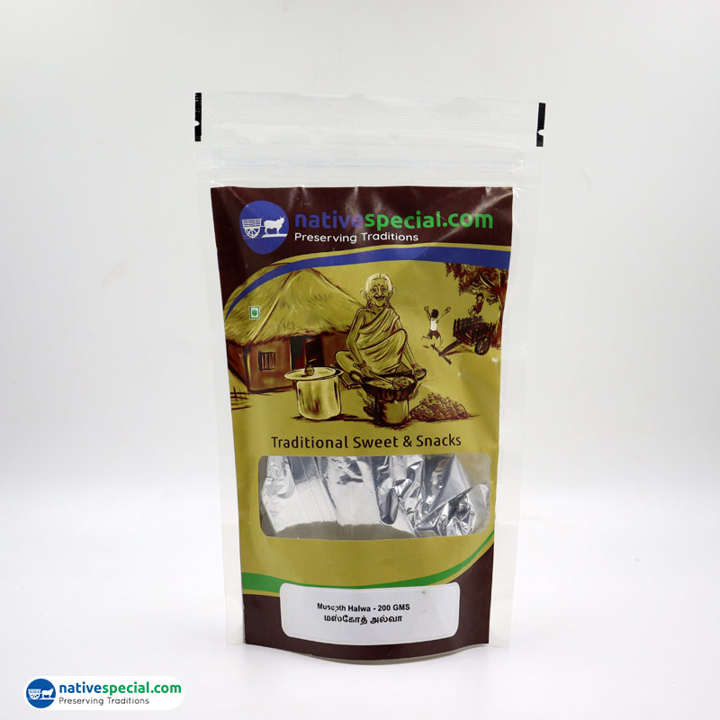 Specialty:A Coconut Milk Delight.The Recipe of the current, Muscoth Halwa, dates back to 1966, when Joseph Abraham, our grand father (1927-2002) started his R&D with Coconut Milk, Cashews, Refined Wheat, Samba Wheat, Raisins and Cardamom. He did this R&D along with his eldest daughter Devakani, that is our Mother, who was then in her teenage.