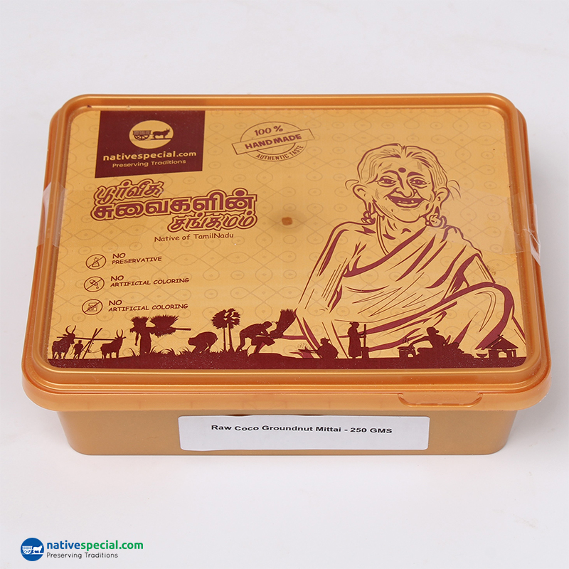 A signature item from NativeSpecial that uncovers a new horizon of taste with traditional kovilpatti kadalai mittai and raw coco. The natural coco is hand processed and blend with the Kadalai mittai. A perfect native signature sweet for Birthday celebrations, Kids and Chocolate lovers.
