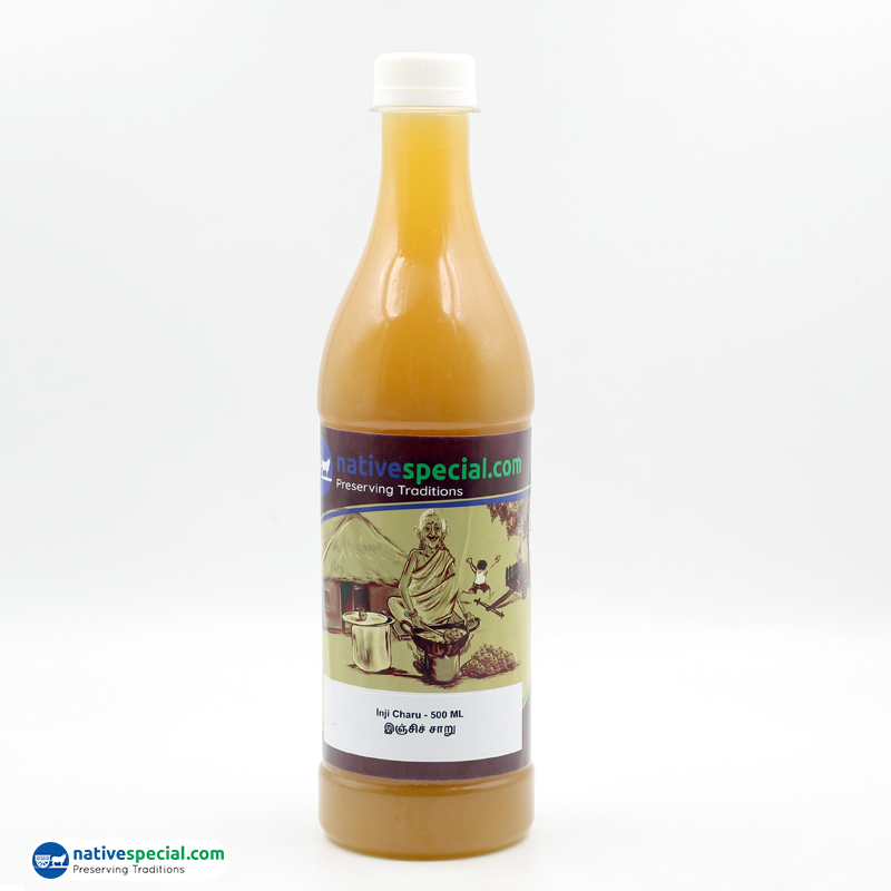 Inji (Ginger) has been widely used for medicinal purpose in Tamil Nadu. It is still part of mainstream cooking. The speciality of Ginger is its ability to control the acidic content in our body. Because of its ability to control the acidic content the cholestrol level will not be aggrevated in our body. Increase in acidic content will directly increase bad cholestrol in our body. This Inji Charu (Ginger Sarbath) is made from home grow Ginger plantations.