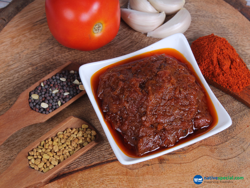 Ingredients:Fresh Tomato, Garlic, Red Chilli Powder, Salt, Mustard Powder, Fenugreek Powder, Asafoetida, Sesame Oil