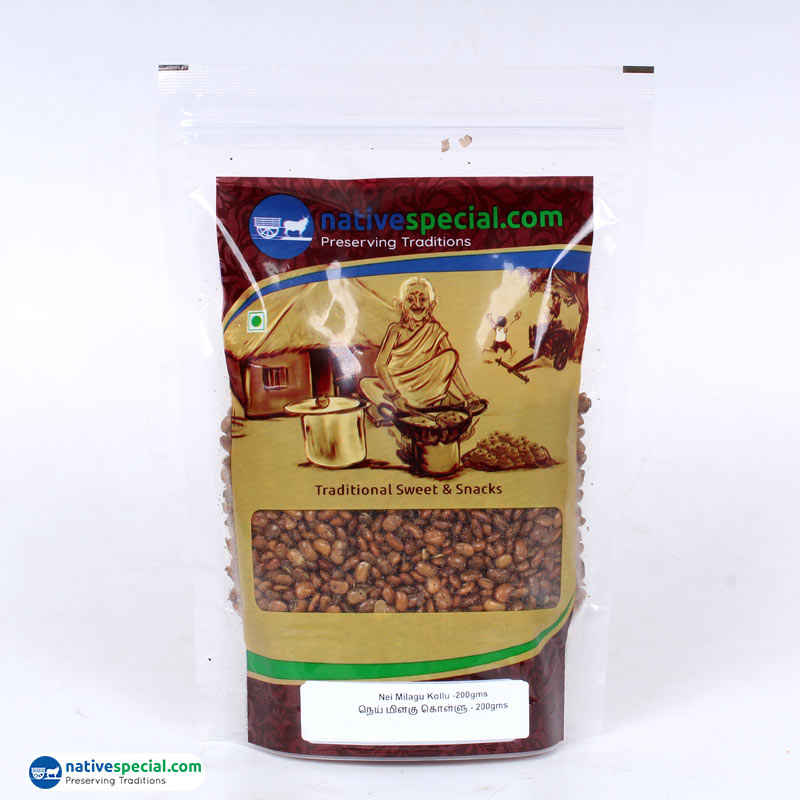 As NativeSpecial we explore these underutilized traditional intakes and make it accessible to larger audience. This Nei Milagu Kollu (Ghee Pepper HorseGram) snack is a traditional snack made for kids and grown ups. Horsegram can be taken in many ways like Soup, Rice Mix, Rasam, etc., But this snack provides a much easier alternative to consume it on every day without any preparation work.